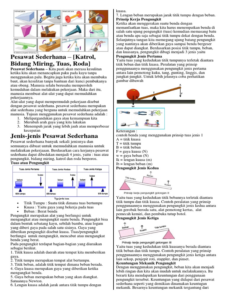 Katrol merupakan roda yang berputar pada sebuah poros yang diberi tali atau rantai pada. Contoh baji adalah kapak (2), pisau dan pahat. Hal ini dimungkinkan terjadi dengan adanya sebuah batang ungkit (tuas) dengan titik tumpu, titik gaya, dan titik yang divariasikan letaknya. Disebut pesawat sederhana karena hanya memerlukan satu gaya untuk melakukan usaha. Berdasarkan prinsip kerjanya pesawat sederhana ini dapat dibedakan menjadi : Tuas sering digunakan untuk mengangkat benda berat ataupun benda yang berukuran besar. Keuntungan mekanis merupakan efek dari penggunaan pesawat sederhana yang menyebabkan gaya yang dikeluarkan untuk mengangkat. Pengertian pesawat sederhana pesawat sederhana adalah semua alat bantu yang susunannya sederhana dan dapat memudahkan pekerjaan manusia. Keuntungan menggunakan pesawat disebut dengan keuntungan mekanik. Pertama, tuas dengan titik tumpu di antara titik kuasa dan titik beban. Pesawat sederhana adalah alat serbaguna yang disusun dengan cara sederhana yang dapat meringankan atau memudahkan pekerjaan manusia. Pesawat sederhana yaitu alat yang dipakai untuk mempermudah pekerjaan. Tuas atau pengungkit, bidang miring, katrol dan roda berporos.